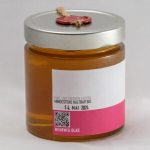 Hinweis: Honig ist ein Naturprodukt und wird nach einigen Monaten kristallisieren. Dadurch entsteht eine grobkörnige Struktur, die vollkommen normal ist. Wenn Sie den Honig wieder verflüssigen möchten, erwärmen Sie ihn am besten im Wasserbad. Achten Sie dabei aber darauf, dass die Temperatur nicht über 40°C steigt, damit die Qualität des Honigs nicht leidet.